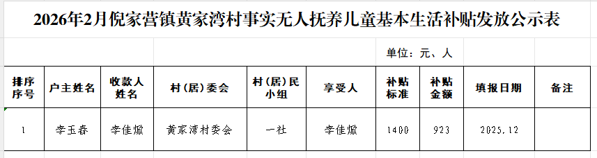 2026年2月倪家营镇黄家湾村事实无人抚养儿童基本生活补贴发放公示