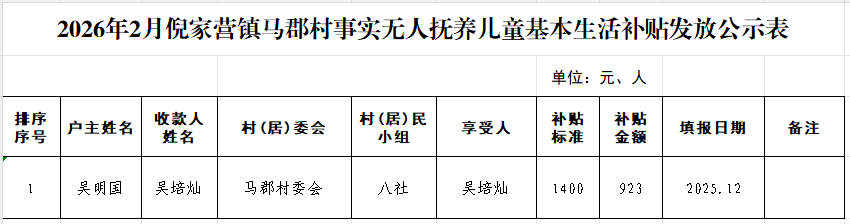 2026年2月倪家营镇马郡村事实无人抚养儿童基本生活补贴发放公示