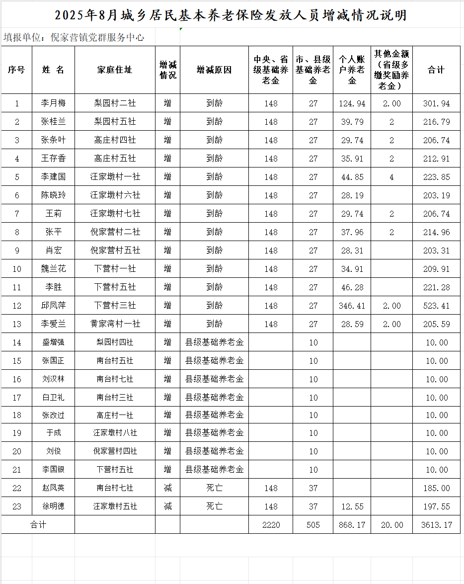 2025年8月倪家营镇城乡居民基本养老保险发放人员增减情况说明