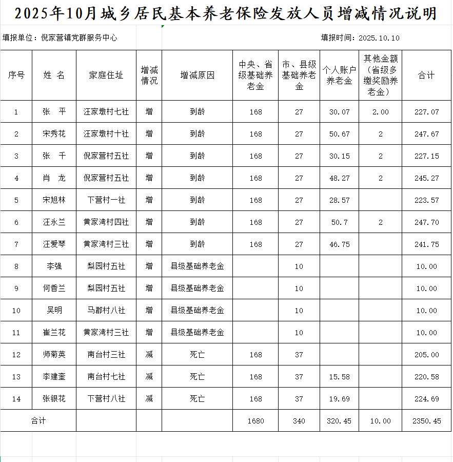 2025年10月倪家营镇城乡居民基本养老保险发放人员增减情况说明