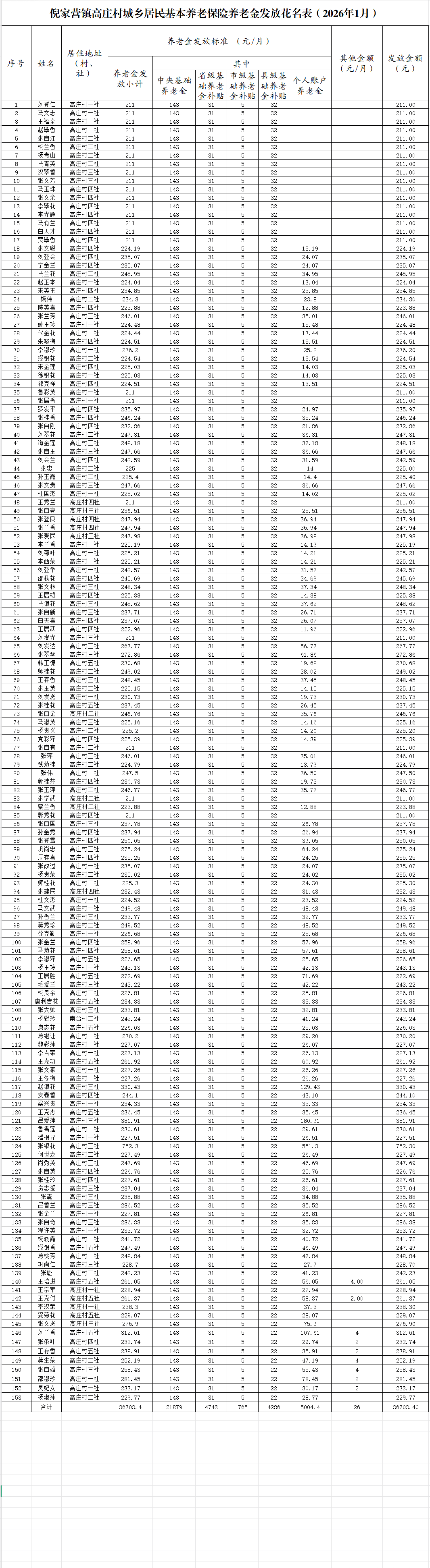 2026年1月倪家营镇高庄村城乡居民基本养老保险养老金发放公示
