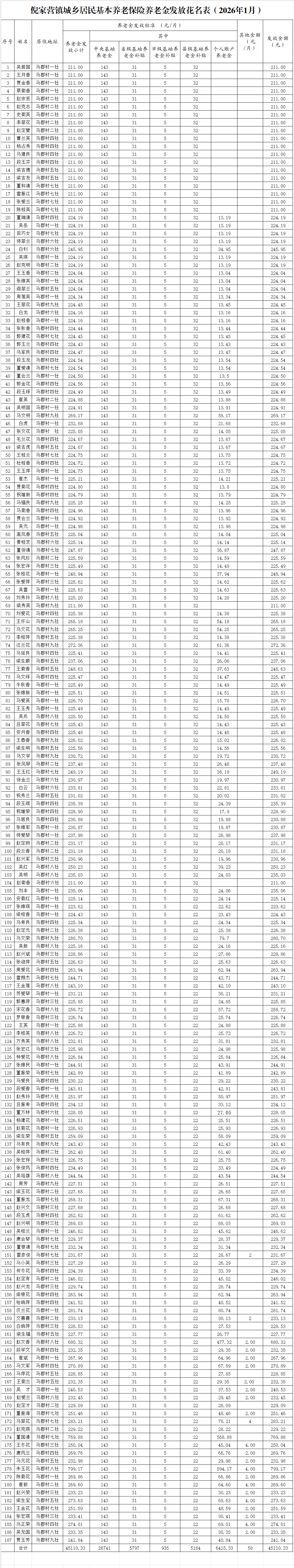 2026年1月倪家营镇马郡村城乡居民基本养老保险养老金发放公示