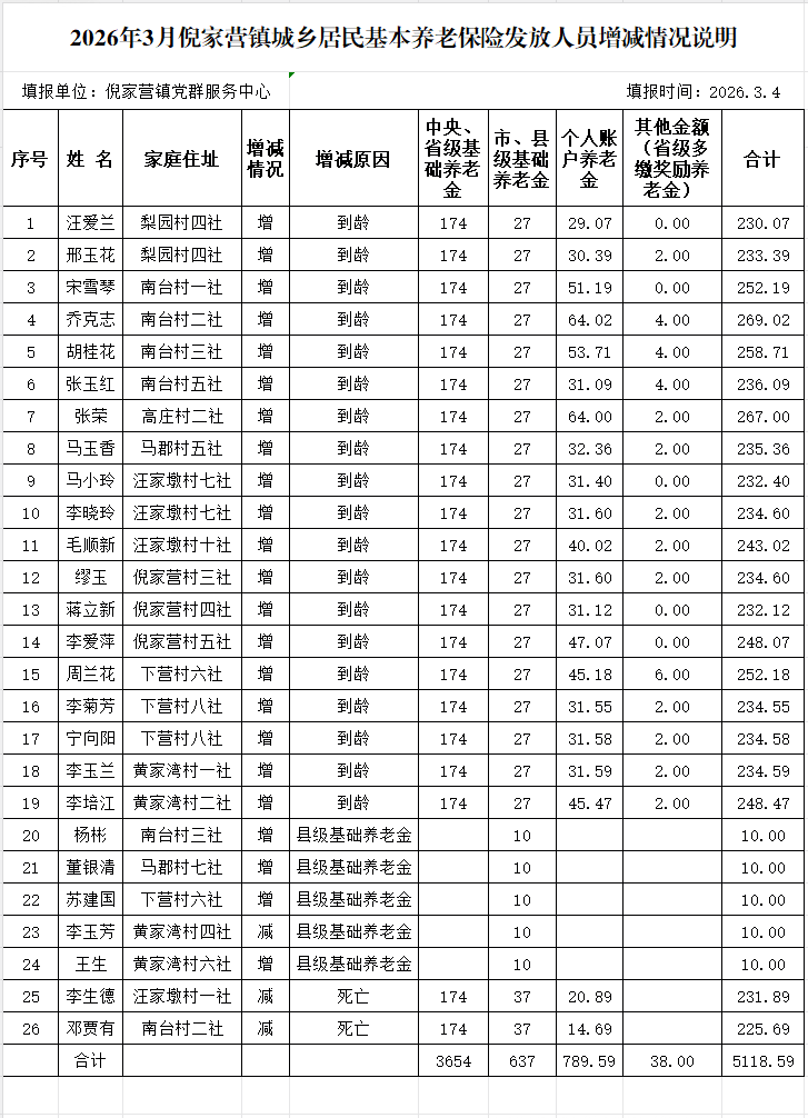 2026年3月倪家营镇城乡居民基本养老保险发放人员增减情况说明