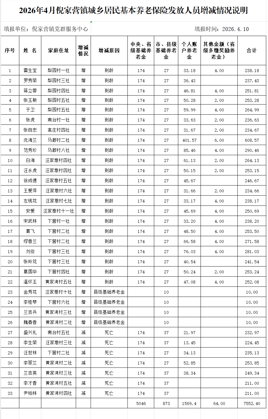 2026年4月倪家营镇城乡居民基本养老保险发放人员增减情况说明