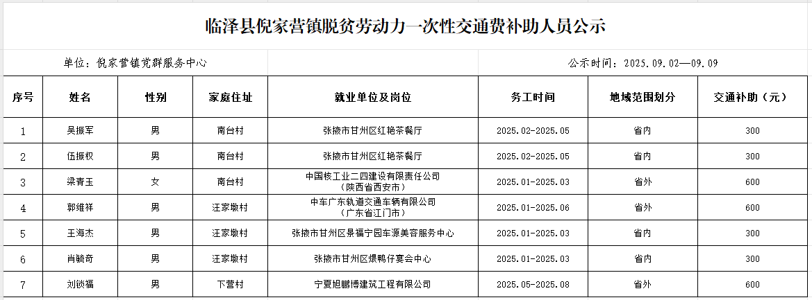 2025年临泽县倪家营镇脱贫劳动力一次性交通费补助人员公示(第四批)