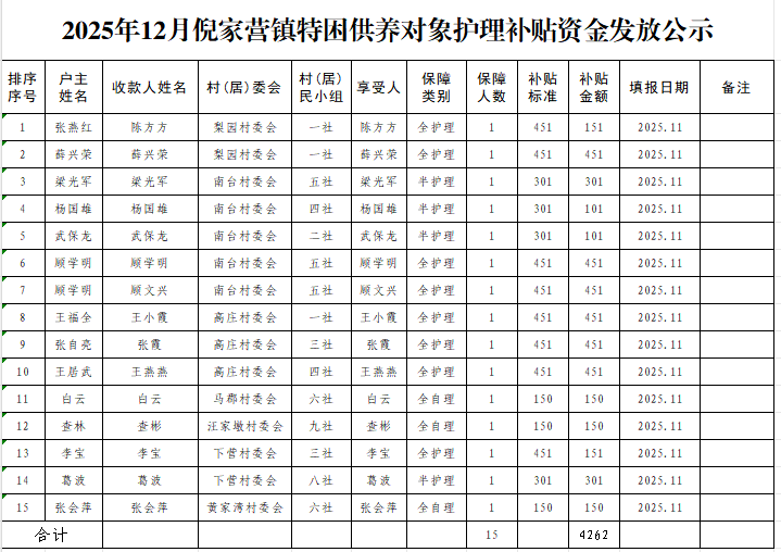 2025年12月倪家营镇特困供养对象护理补贴资金发放公示