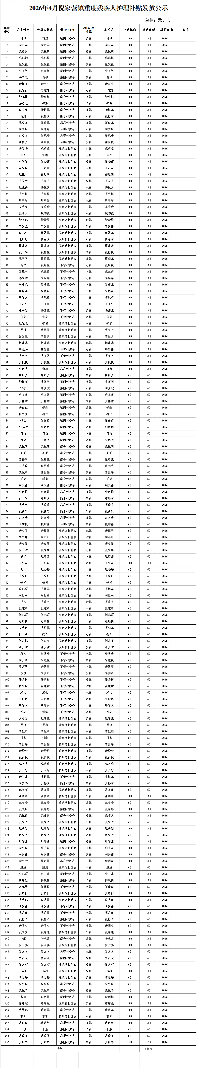 2026年4月倪家营镇重度残疾人护理补贴发放公示