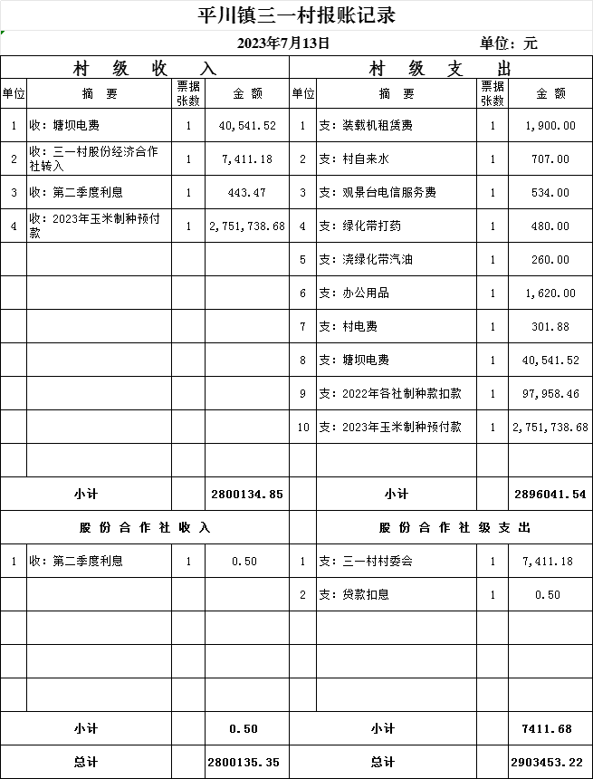 2023年7月平川镇三一村报账记录