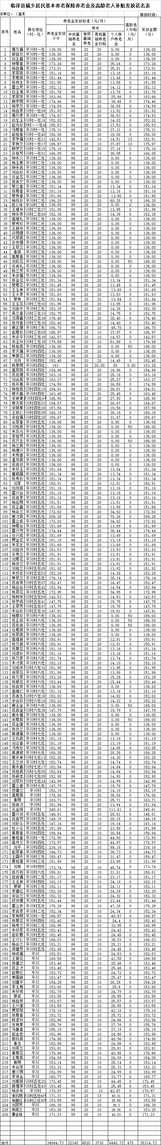 平川村城乡居民基本养老保险2023年8月到龄人员待遇计发表