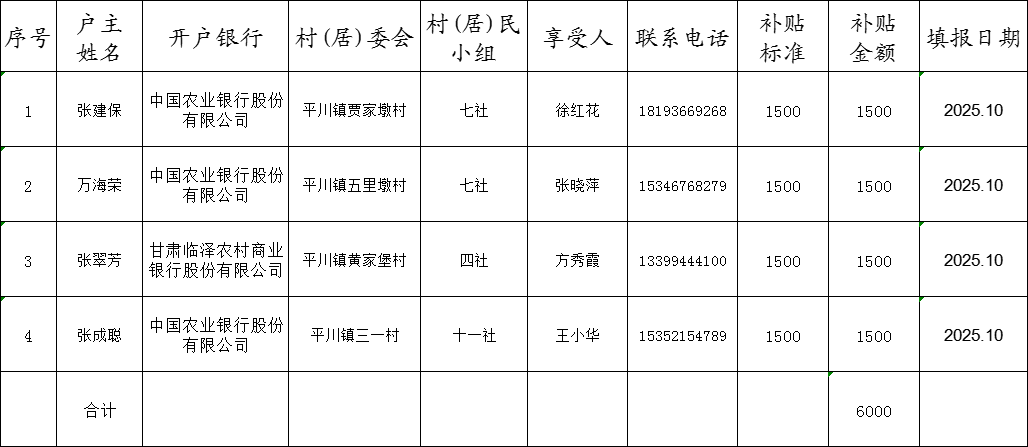 平川镇2025年10月县城安置点易地扶贫搬迁户就业人员岗位补贴发放表