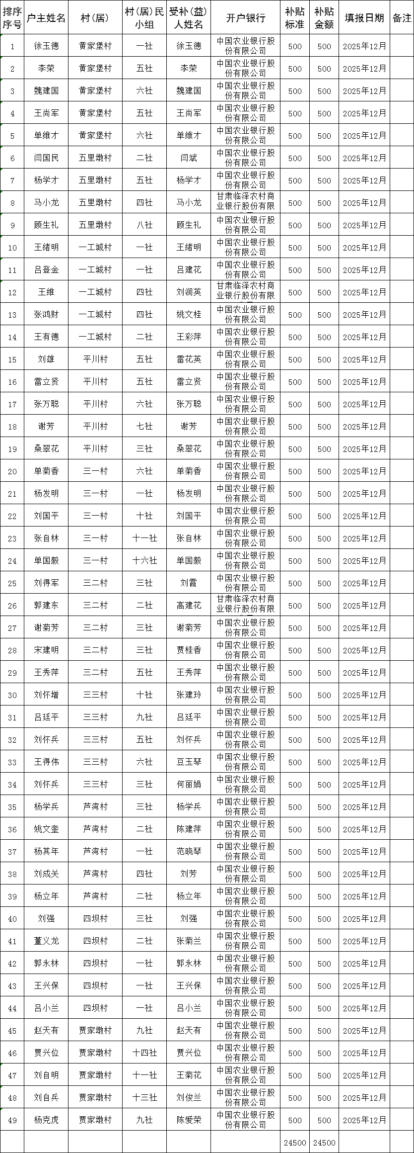 平川镇2025年12月共管共享乡村公益性岗位人员岗位补贴发放表