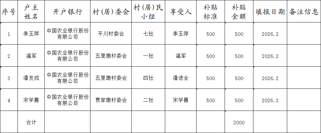 平川镇2026年2月易地扶贫搬迁户乡村公益性岗位人员岗位补贴发放表