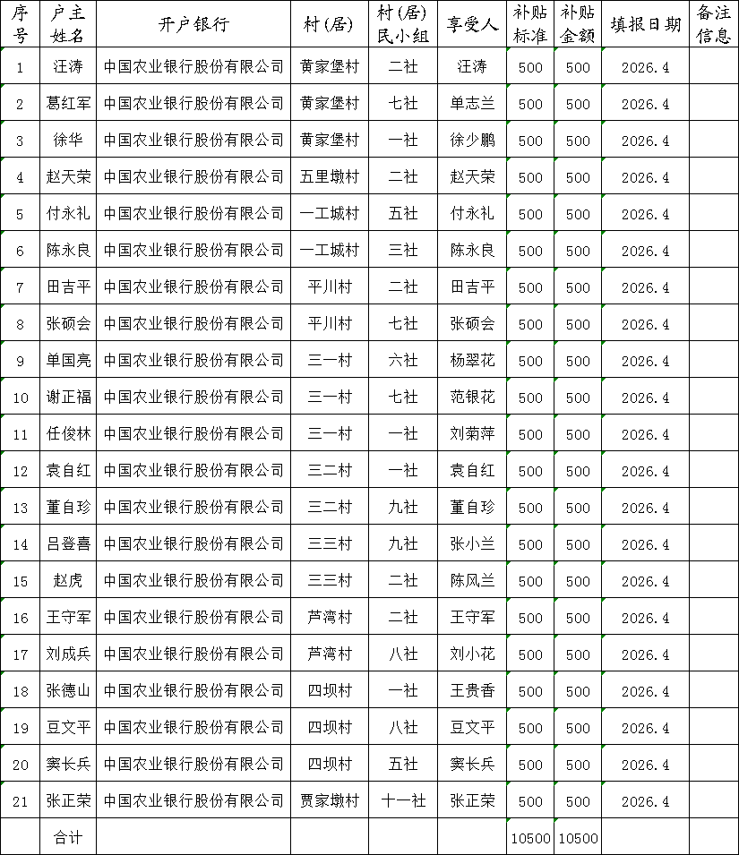 平川镇2026年4月乡村公益性岗位人员岗位补贴发放表