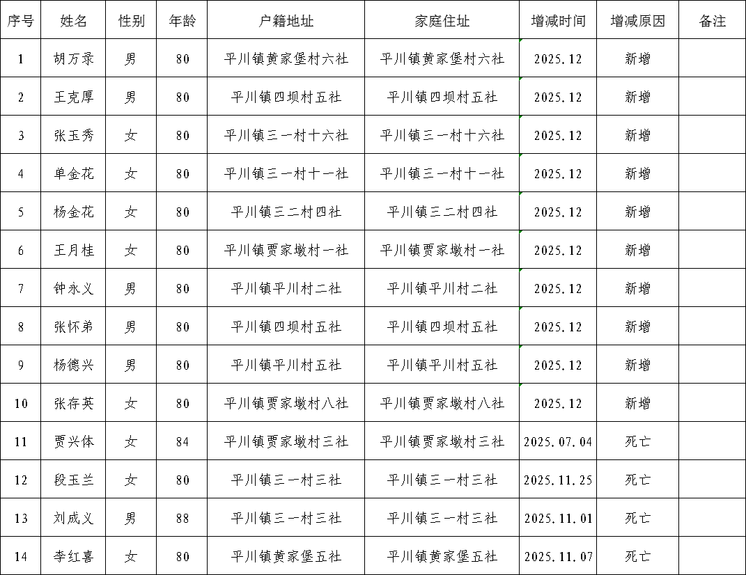 临泽县平川镇12月份高龄津贴发放对象增减变化表