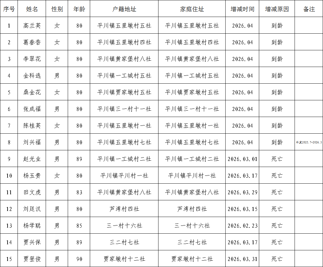 临泽县平川镇4月份高龄津贴发放对象增减变化表