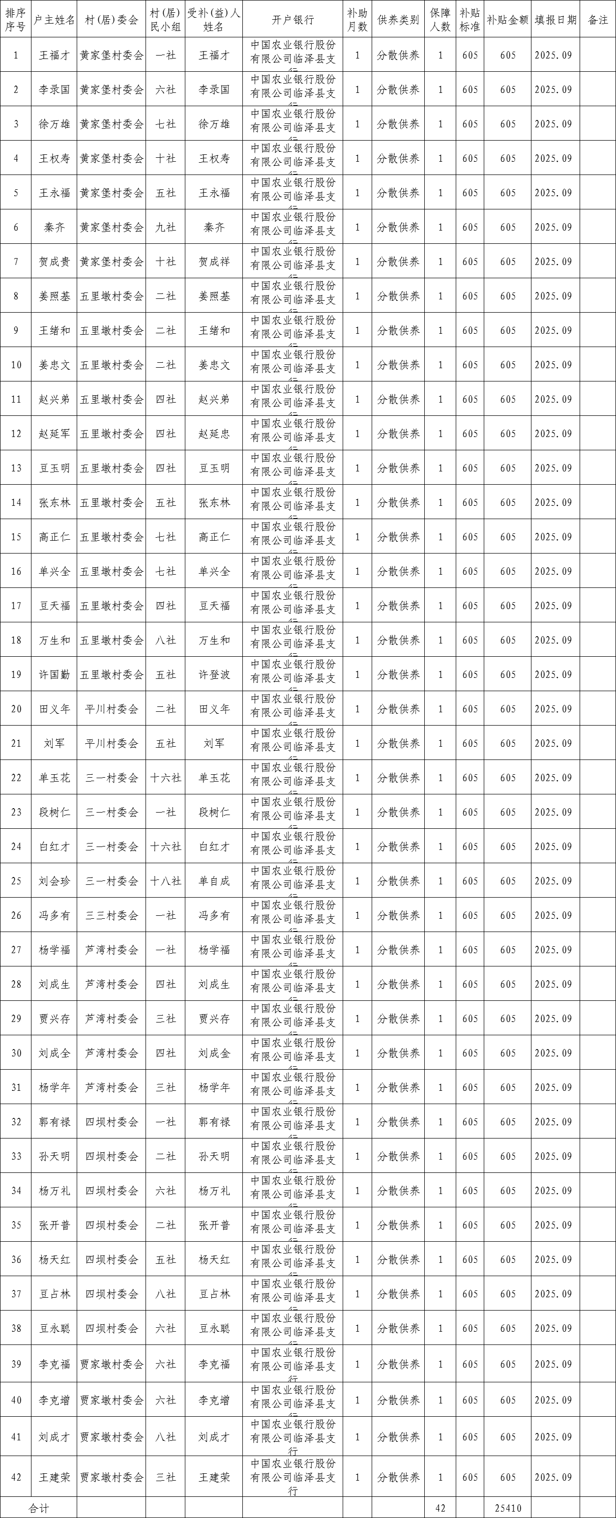 2025年10月临泽县平川镇特困供养对象资金发放表