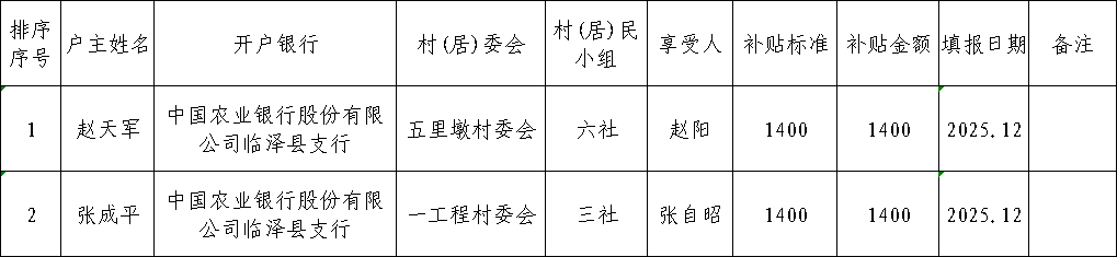 二〇二五年临泽县平川镇孤儿生活费12月发放统计表