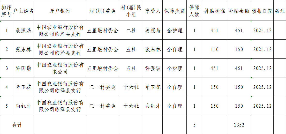 2026年3月临泽县平川镇特困供养对象护理补贴资金发放表