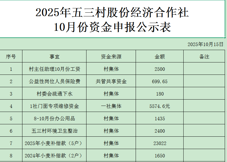 2025年五三村股份经济合作社 10月份资金申报公示表