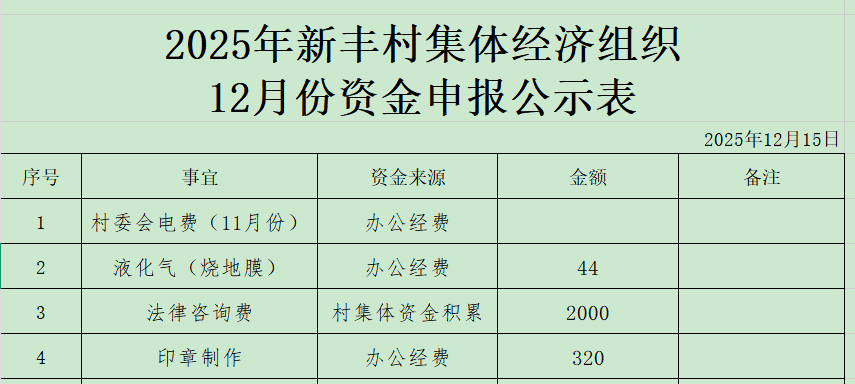 2025年新丰村集体经济组织 12月份资金申报公示表
