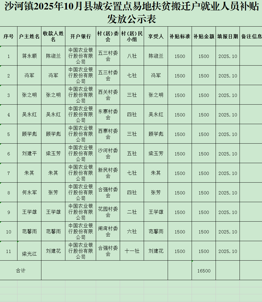 沙河镇2025年10月县城安置点易地扶贫搬迁户就业人员补贴发放公示表