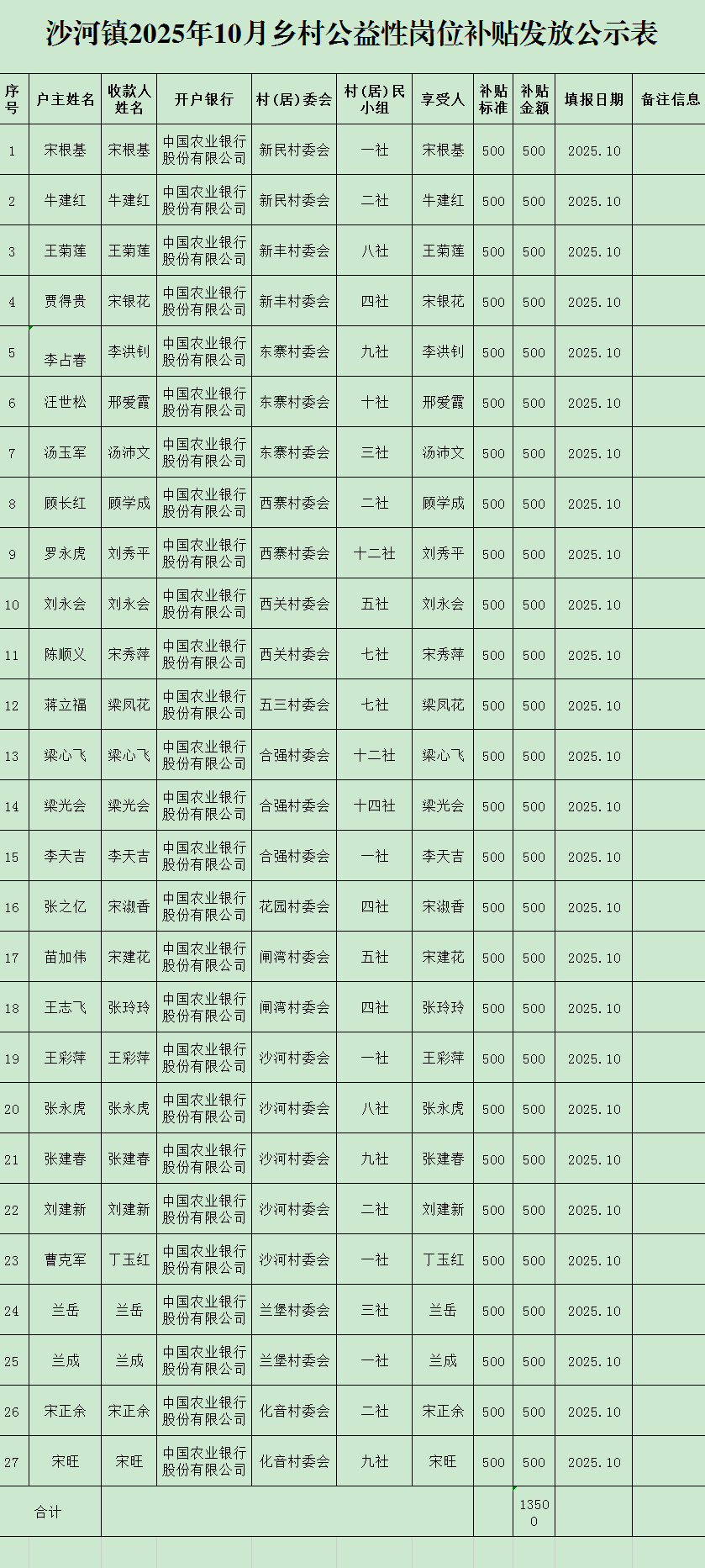 沙河镇2025年10月乡村公益性岗位补贴发放公示表