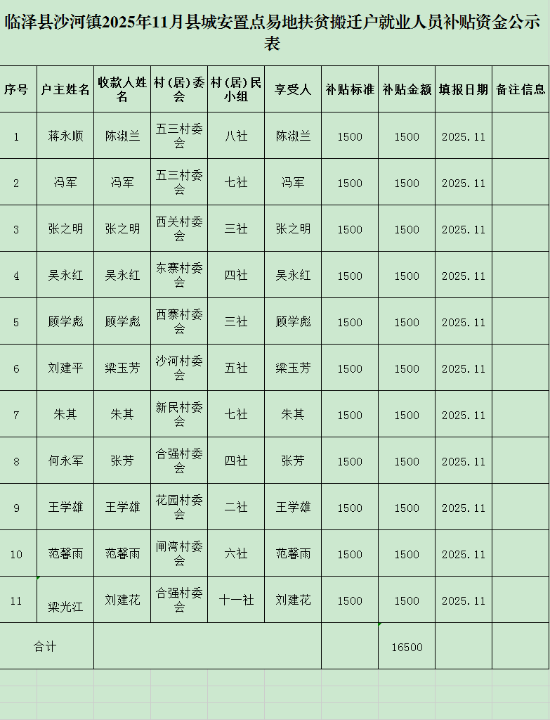 临泽县沙河镇2025年11月县城安置点易地扶贫搬迁户就业人员补贴资金公示表