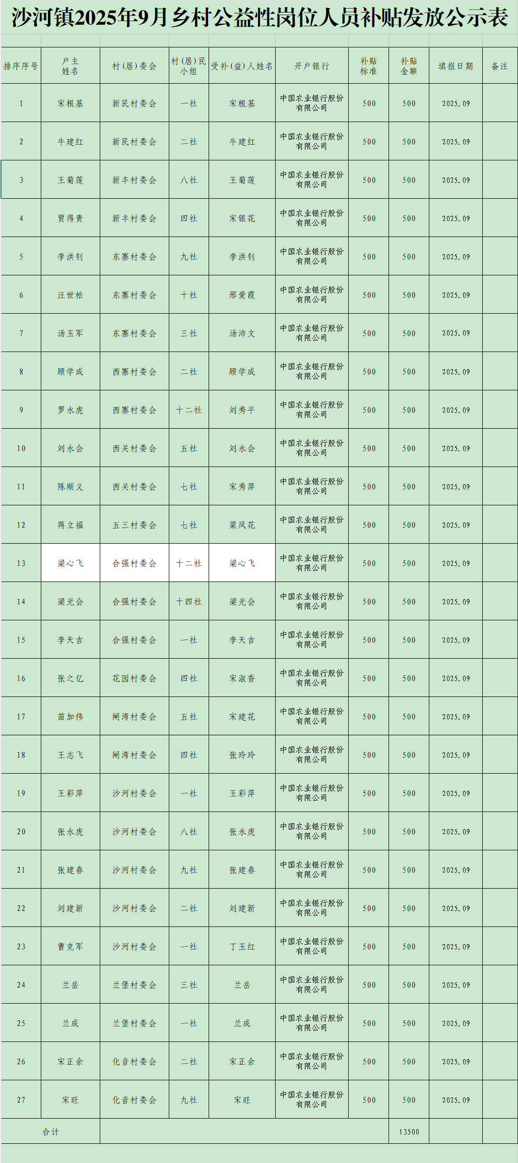 沙河镇2025年9月乡村公益性岗位人员补贴发放公示表