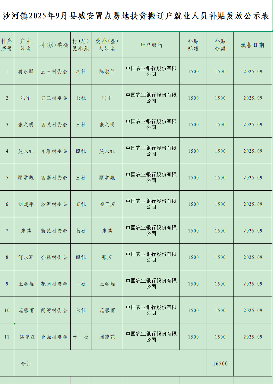 沙河镇2025年9月县城安置点易地扶贫搬迁户就业人员补贴发放公示表