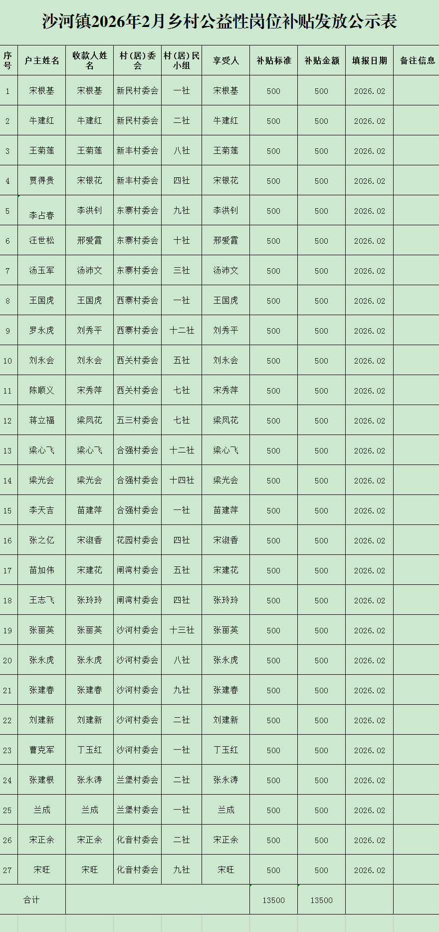 沙河镇2026年2月乡村公益性岗位补贴发放公示表
