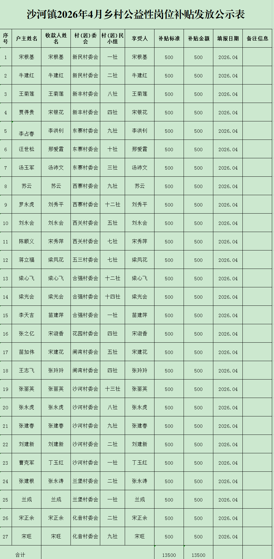 沙河镇2026年4月乡村公益性岗位补贴发放公示表