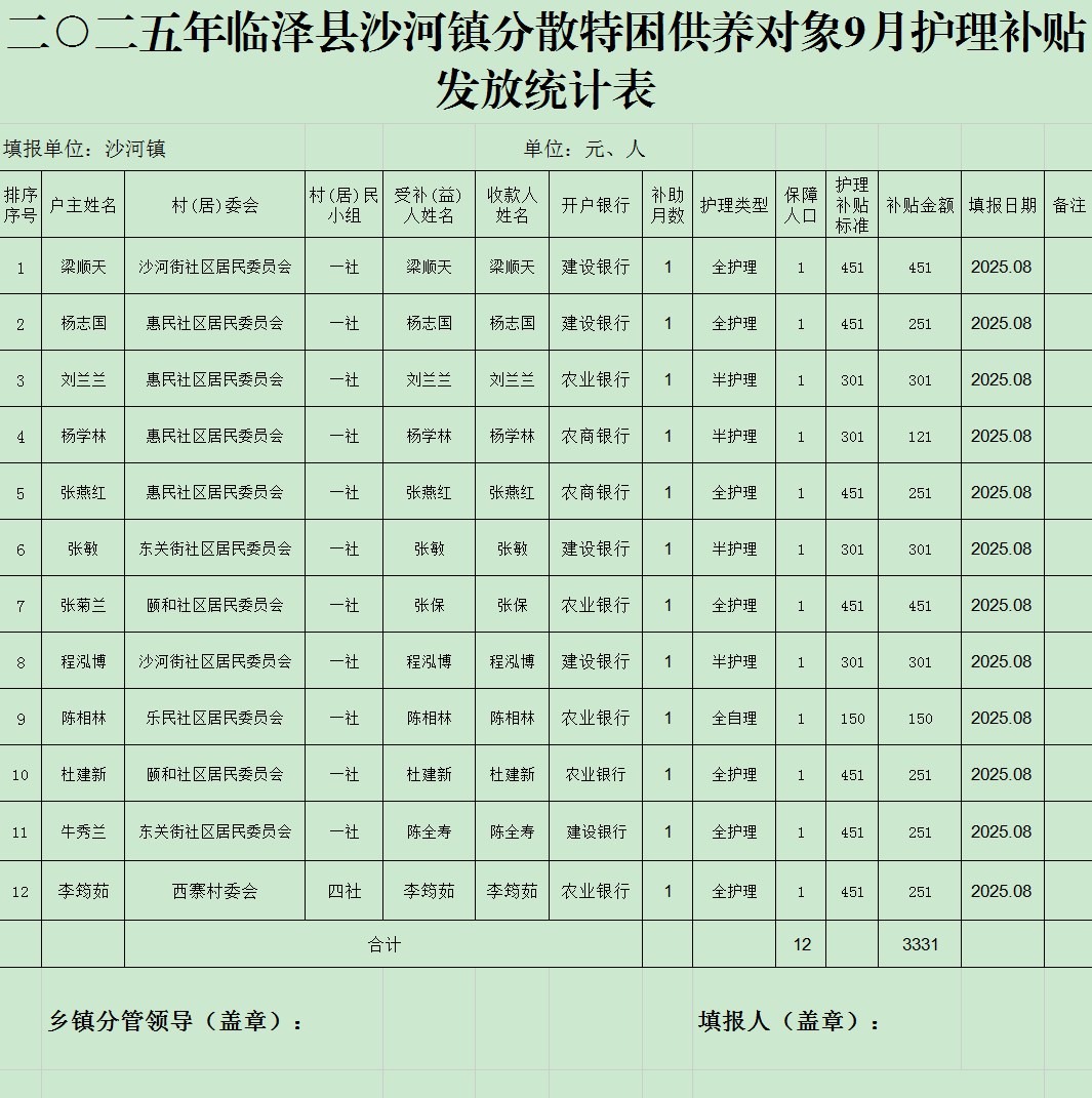 二○二五年临泽县沙河镇分散特困供养对象9月护理补贴发放统计表
