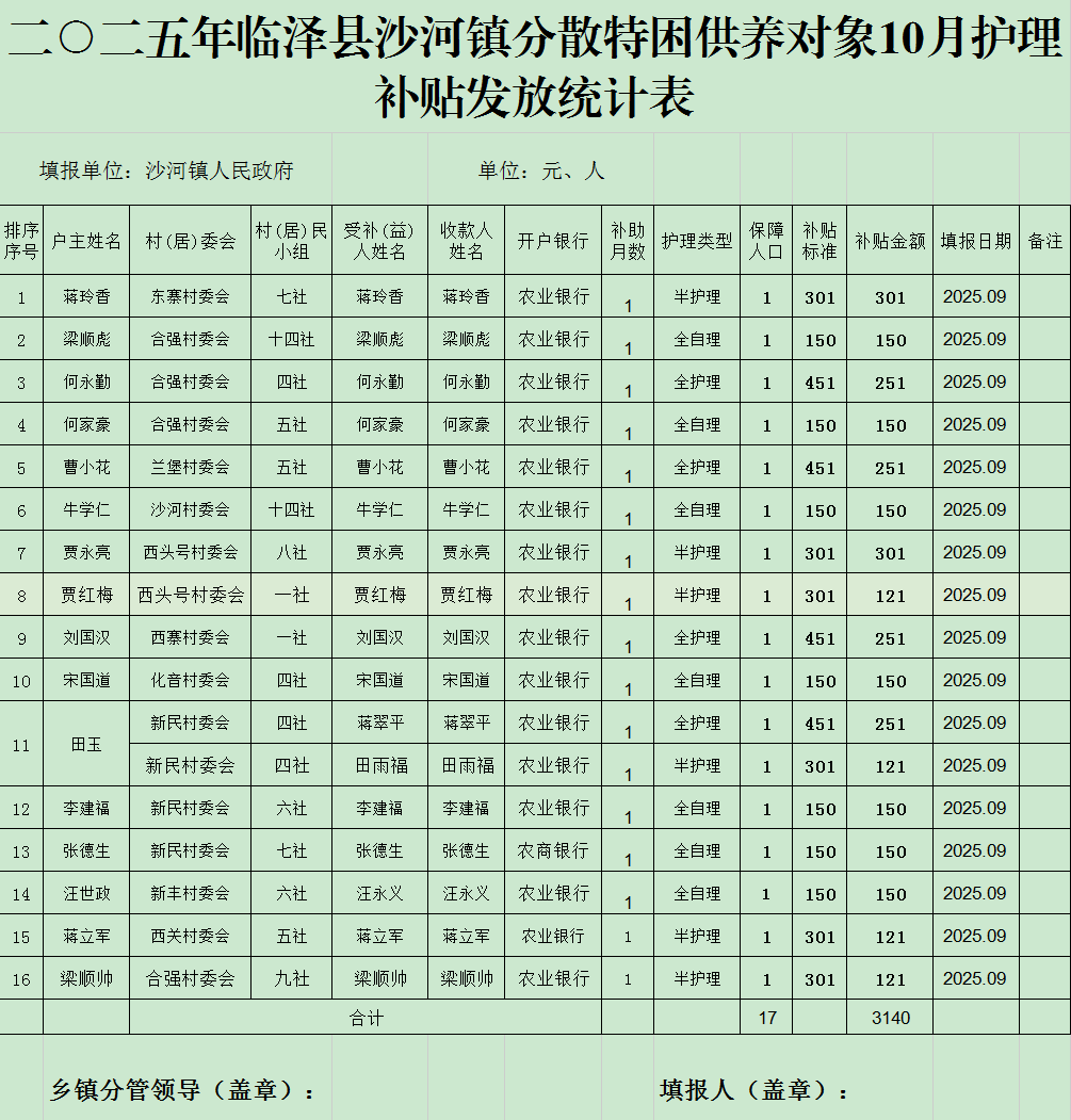 二○二五年临泽县沙河镇农村分散特困供养对象10月护理补贴发放统计表