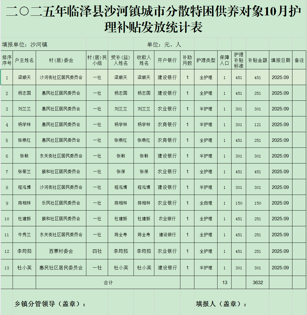 二○二五年临泽县沙河镇城市分散特困供养对象10月护理补贴发放统计表