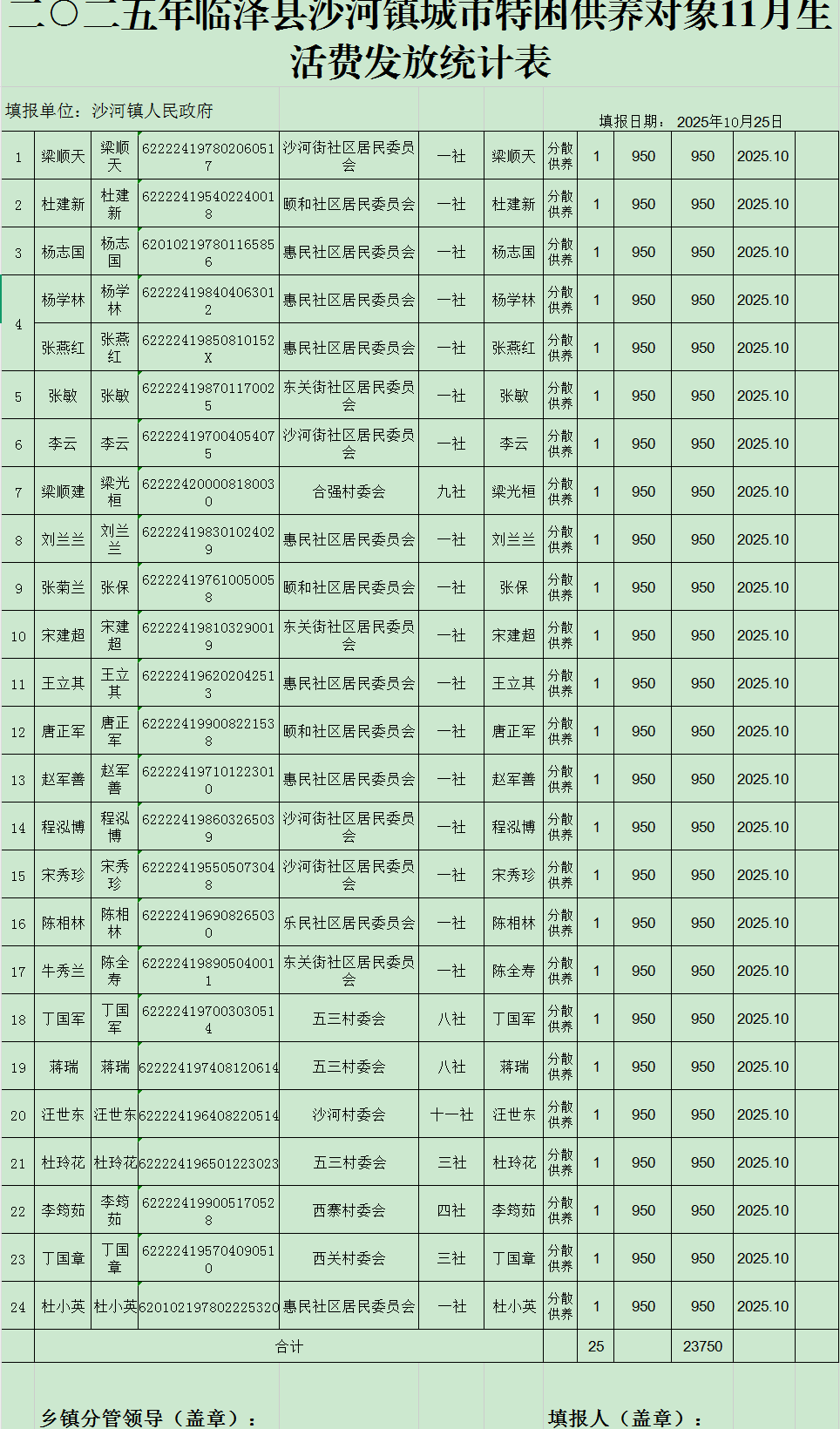 二○二五年临泽县沙河镇城市特困供养对象11月生活费发放统计表