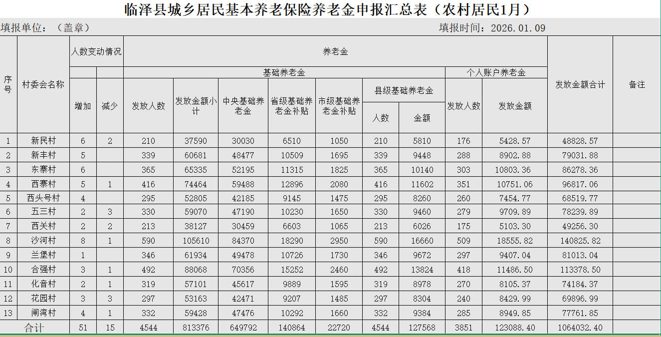 临泽县城乡居民基本养老保险养老金申报汇总表(农村居民1月)