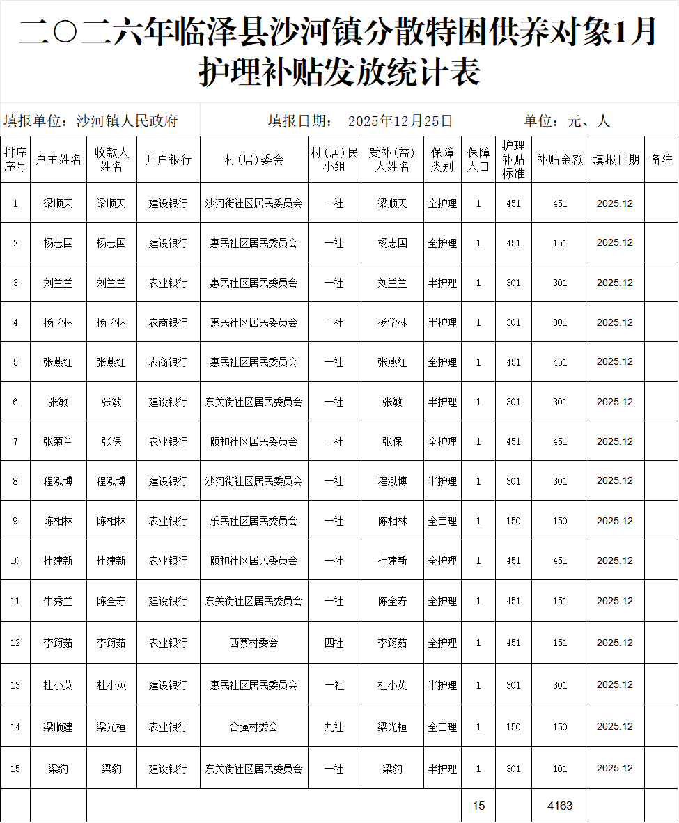 二○二六年临泽县沙河镇农村特困供养对象1月生活费发放统计表