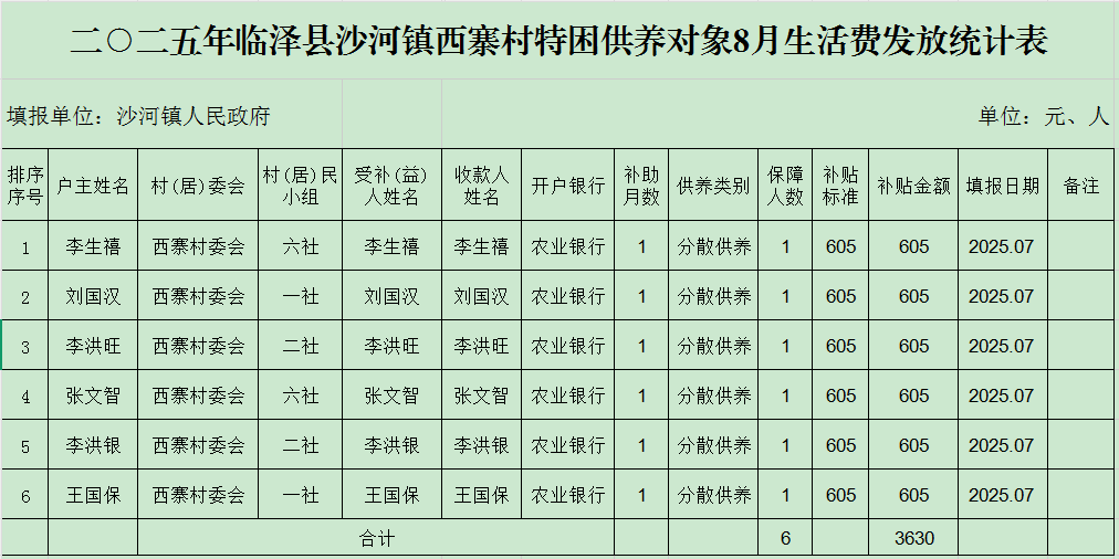 二○二五年临泽县沙河镇西寨村特困供养对象8月生活费发放统计表