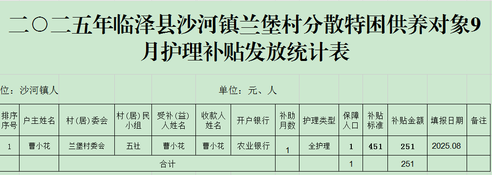 二○二五年临泽县沙河镇兰堡村分散特困供养对象9月护理补贴发放统计表