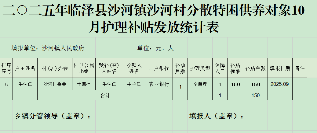 二○二五年临泽县沙河镇沙河村分散特困供养对象10月护理补贴发放统计表 二○二五年临泽县沙河镇沙河村分散特困供养对象10月护理补贴发放统计表 二○二五年临泽县沙河镇沙河村分散特困供养对象10月护理补贴发放统计表 二○二五年临泽县沙河镇沙河村分散特困供养对象10月护理补贴发放统计表 二○二五年临泽县沙河镇沙河村分散特困供养对象10月护理补贴发放统计表