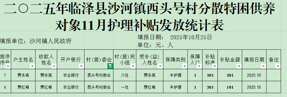 二○二五年临泽县沙河镇西头号村分散特困供养对象11月护理补贴发放统计表