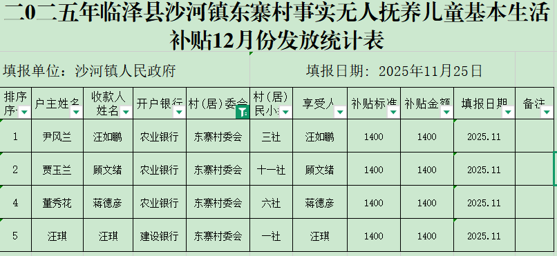 二0二五年临泽县沙河镇东寨村事实无人抚养儿童基本生活补贴12月份发放统计表