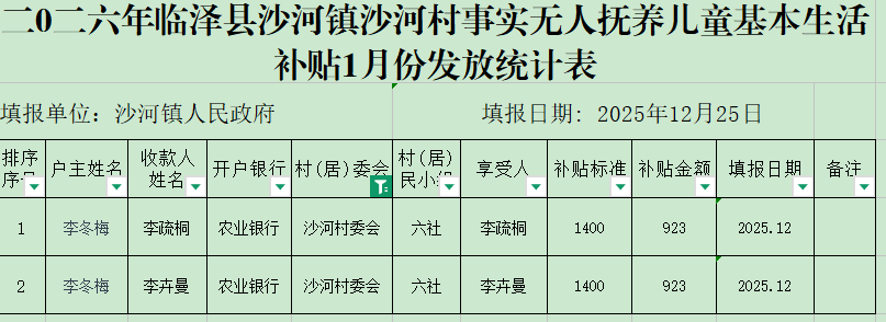 二0二六年临泽县沙河镇沙河村事实无人抚养儿童基本生活补贴1月份发放统计表