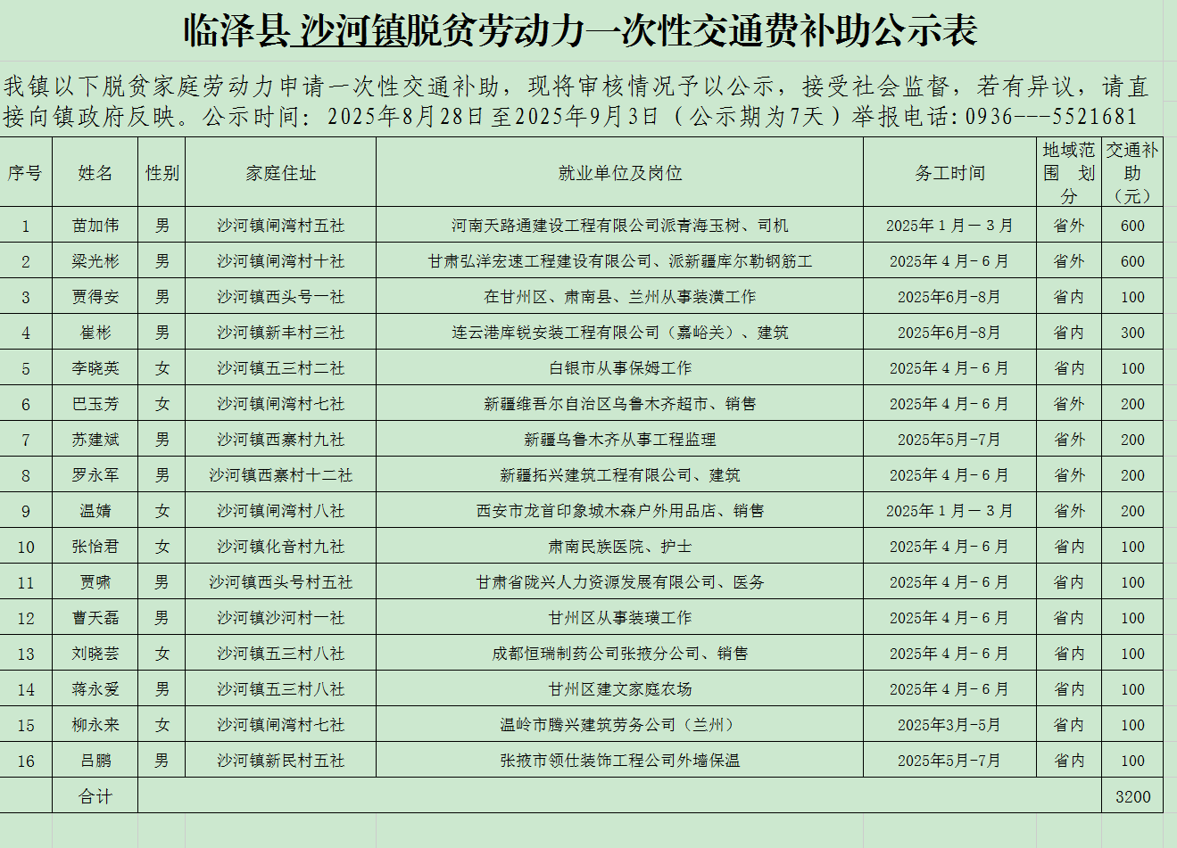 临泽县 沙河镇脱贫劳动力一次性交通费补助公示表