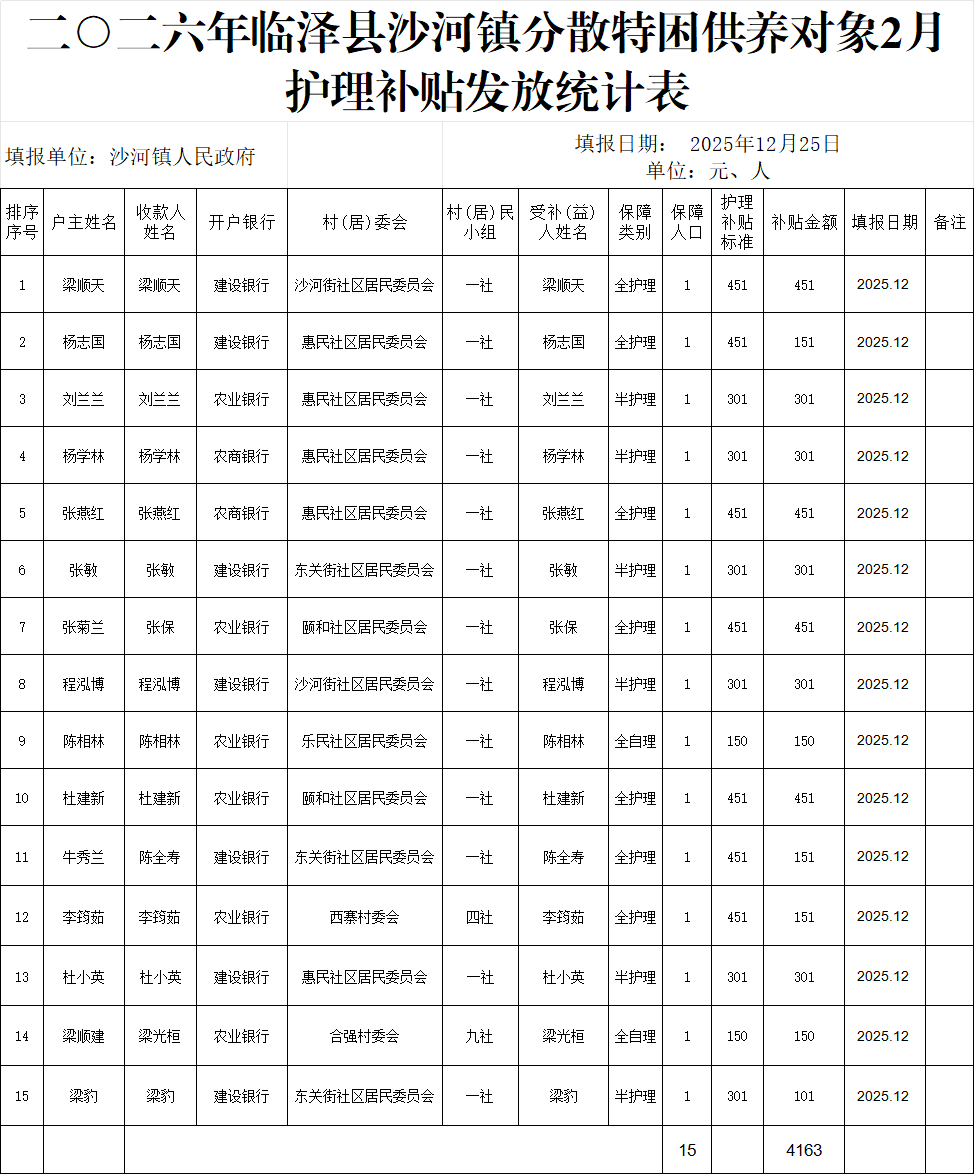 二○二六年临泽县沙河镇城市分散特困供养对象2月护理补贴发放统计表