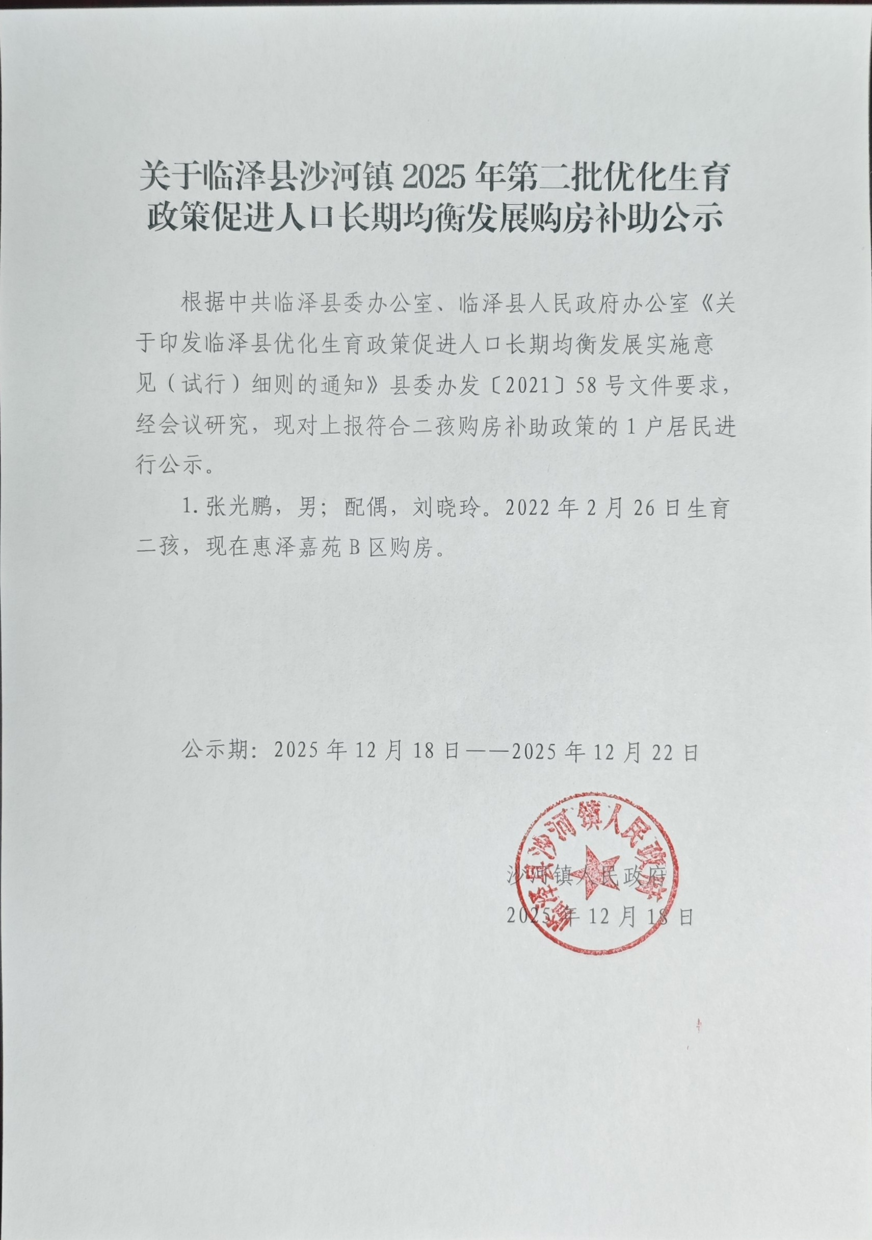 关于临泽县沙河镇2025年第二批优化生育政策促进人口长期均衡发展购房补助公示