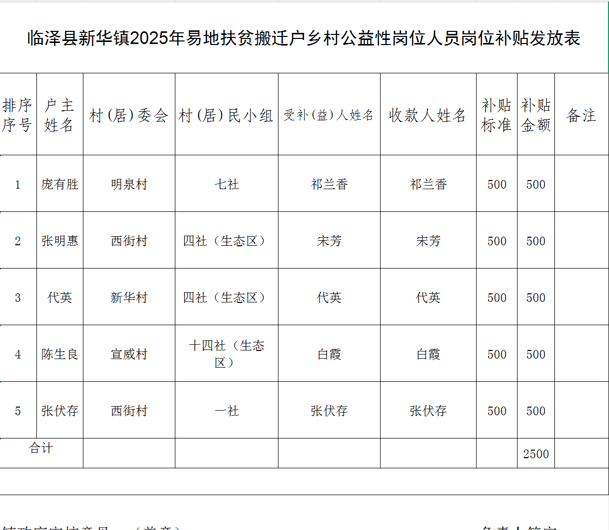 临泽县新华镇2025年易地扶贫搬迁户乡村公益性岗位人员岗位补贴发放表