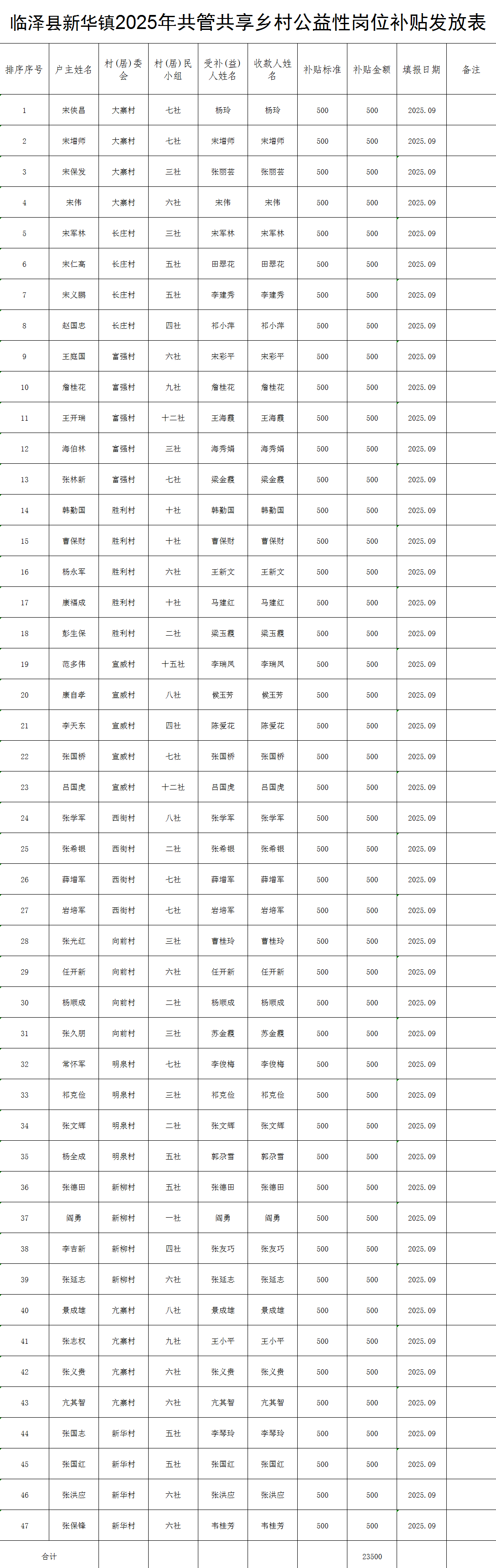 临泽县新华镇2025年共管共享乡村公益性岗位补贴发放表