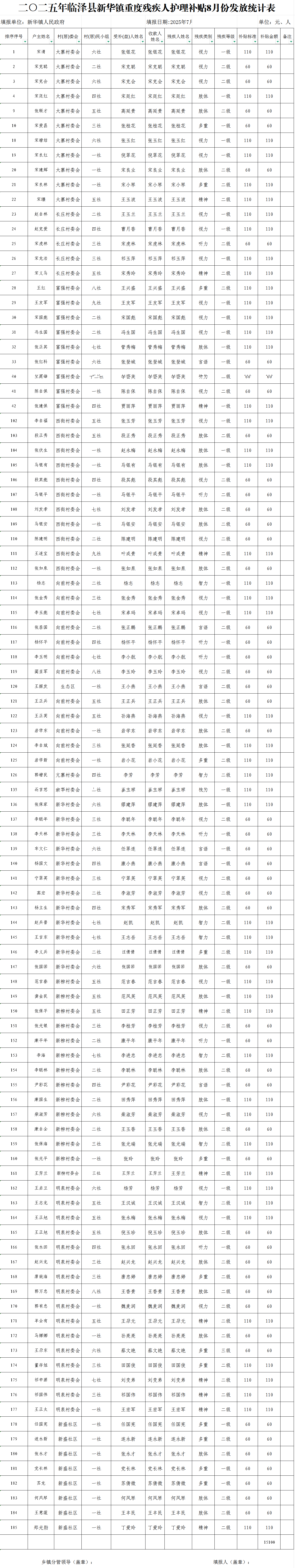 2025年临泽县新华镇重度残疾人护理补贴8月份发放统计表