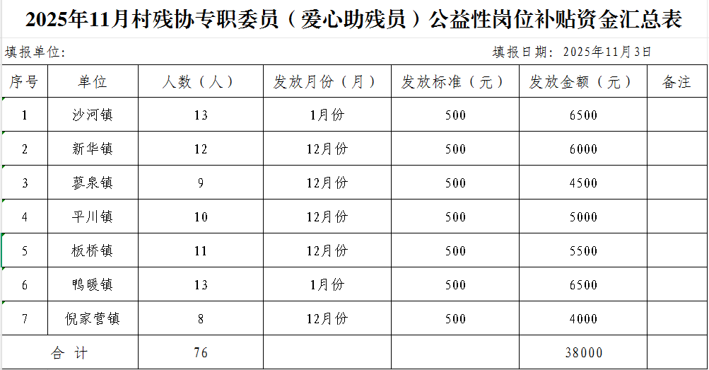 2025年11月村残协专职委员(爱心助残员)公益性岗位补贴资金汇总表